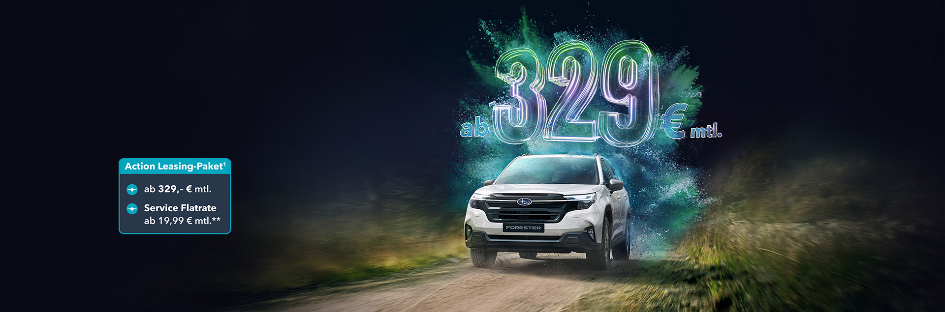 1 Die Aktion gilt vom 01.04.2026 bis 30.06.2026 in Verbindung mit dem Leasing eines aktuellen Subaru Forester (Modelljahr 2025/2026) (Neu- oder Vorführwagen), Zulassung / Besitzumschreibung bis 31.12.2026 bei teilnehmenden Subaru Partnern. Die Aktion wird von der SUBARU Deutschland GmbH getragen und ist nicht mit anderen Aktionen der SUBARU Deutschland GmbH kombinierbar mit Ausnahme des Aktionsangebots zur Service-Flatrate. Weitere Detailinformationen erhalten Sie bei Ihrem teilnehmenden Subaru-Partner oder unter www.subaru.de. Musterrechnung: Subaru Forester MJ26 Exclusive Leasingbeispiel (gültig bis 30.06.2026): Anzahlung 0,00 EUR, monatliche Rate 329 EUR, Laufzeit 36 Monate, Laufleistung p. a. 10.000 km, zzgl. Überführungskosten 945,00 EUR, Gesamtpreis (inkl. Überführungskosten) 36.481,10 EUR. Ein Freibleibendes Leasingangebot der SUBARU Finance, ein Service der MCE Bank GmbH, Schieferstein 9, 65439 Flörsheim. Alle Preise verstehen sich inkl. Umsatzsteuer.